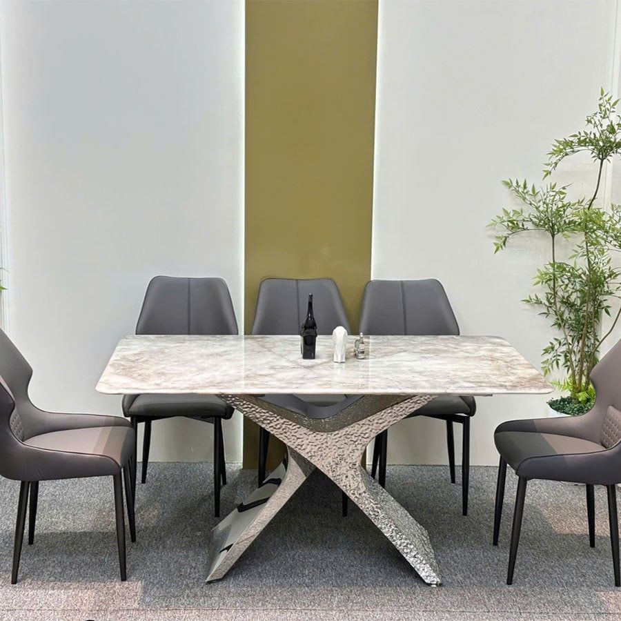 - Chất liệu: Mặt bàn đá vi tinh thể cao cấp, khung bàn inox sáng bóng