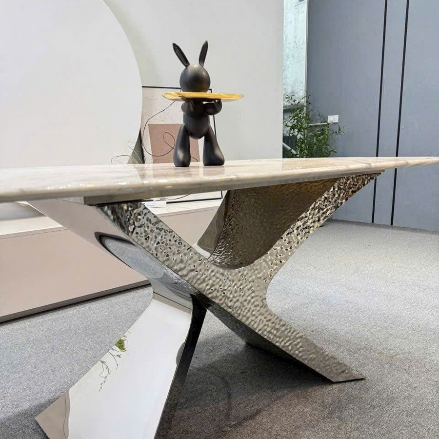Bàn ăn VNBA01 là mẫu bàn ăn mặt đá cao cấp thuộc dòng sang trọng nhất của Laviehome, sở hữu thiết kế ấn tượng với mặt đá vi tinh thể bóng mịn và chân bàn inox tạo hình nghệ thuật độc đáo. Sự kết hợp tinh tế giữa vẻ đẹp tự nhiên của mặt đá và ánh kim sang trọng của inox đem đến một tổng thể hiện đại, đẳng cấp – phù hợp với nhiều không gian nội thất từ chung cư cao cấp đến biệt thự.