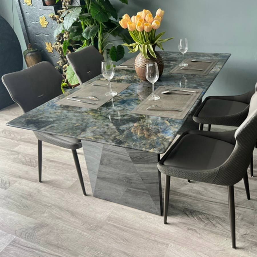 Bàn ăn cao cấp mặt đá Crom có độ dày 4cm, với khả năng chịu lực tốt, chống trầy xước và chống thấm nước, giúp dễ dàng vệ sinh và bảo trì. Phần chân bàn làm từ inox 201 tráng gương sáng bóng, giúp không gian trở nên sang trọng và đẳng cấp hơn.