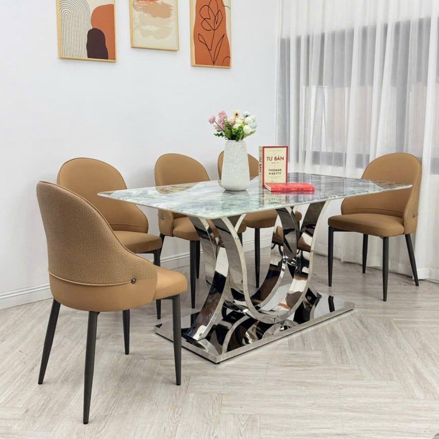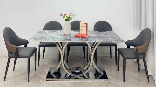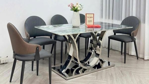 Mặt bàn được chế tác từ đá tinh thể cao cấp, có vân tự nhiên sắc nét, giúp bàn vừa bền bỉ vừa có tính thẩm mỹ cao. Sự kết hợp giữa inox gương và mặt đá giúp không gian ăn uống trở nên hiện đại, đậm chất châu Âu.