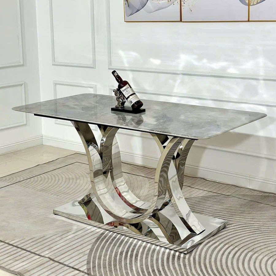 Chất liệu: Mặt bàn đá tinh thể cao cấp, khung inox tráng gương sáng bóng
