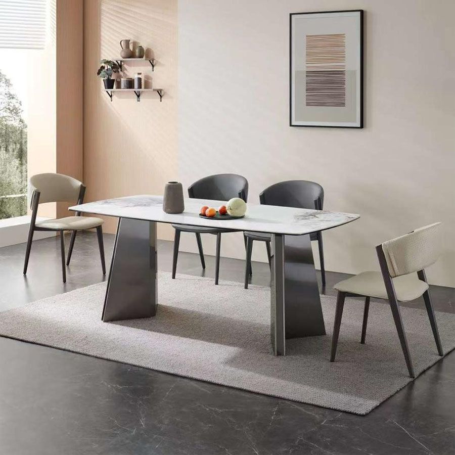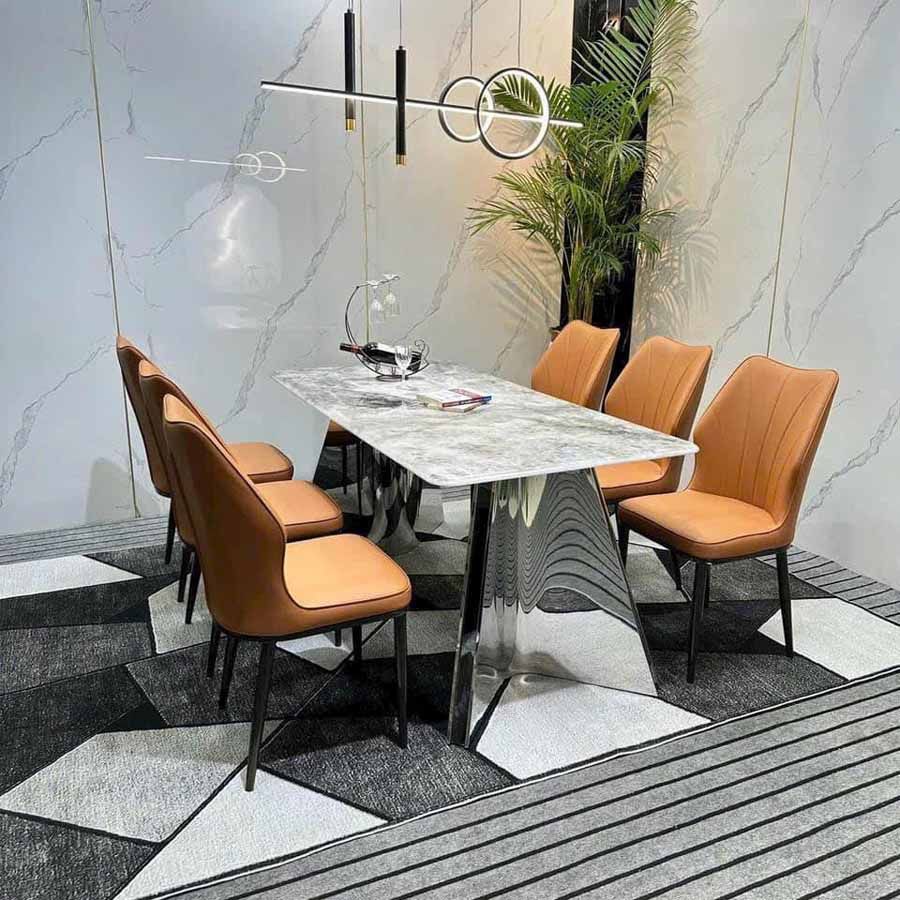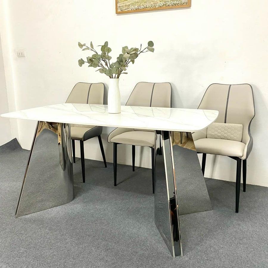 Mẫu bàn ăn hiện đại mặt đá Carol được làm từ inox 201 tráng gương sáng bóng, tạo độ bền cao và khả năng chịu lực vượt trội. Thiết kế chân bàn độc đáo giúp bàn ăn vững chắc, đồng thời tạo điểm nhấn ấn tượng cho không gian phòng ăn.