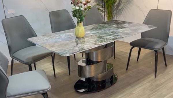 Bàn ăn inox tráng gương mặt đá Gaia là mẫu thiết kế lý tưởng dành cho không gian hiện đại yêu cầu sự tinh tế và cá tính. Với thiết kế chân bàn tròn bo thanh thoát kết hợp cùng khung inox chắc chắn, mặt đá vân tự nhiên, sản phẩm mang lại sự cân bằng hoàn hảo giữa thẩm mỹ và công năng sử dụng. Đây là mẫu bàn ăn hiện đại mặt đá lý tưởng cho căn hộ chung cư, nhà phố hoặc biệt thự hiện đại.