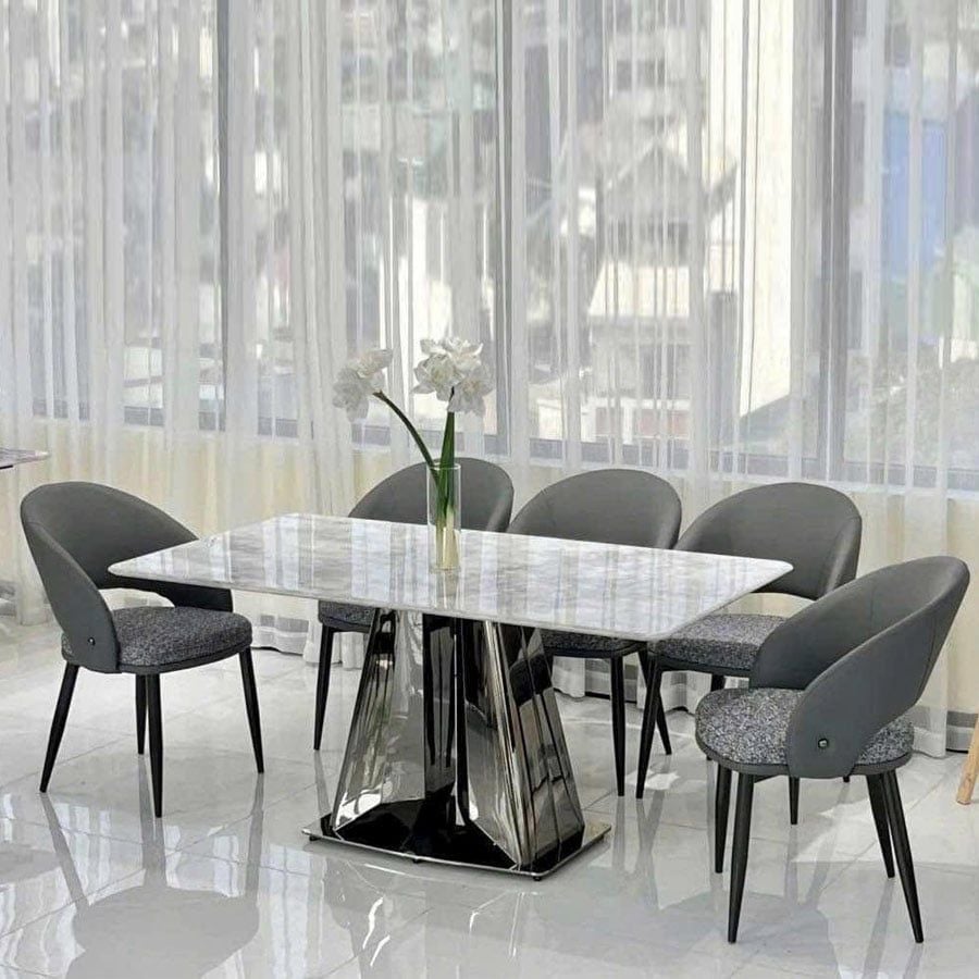 - Mặt bàn ăn sử dụng đá marble tự nhiên, vân đá sắc nét, bền bỉ theo thời gian