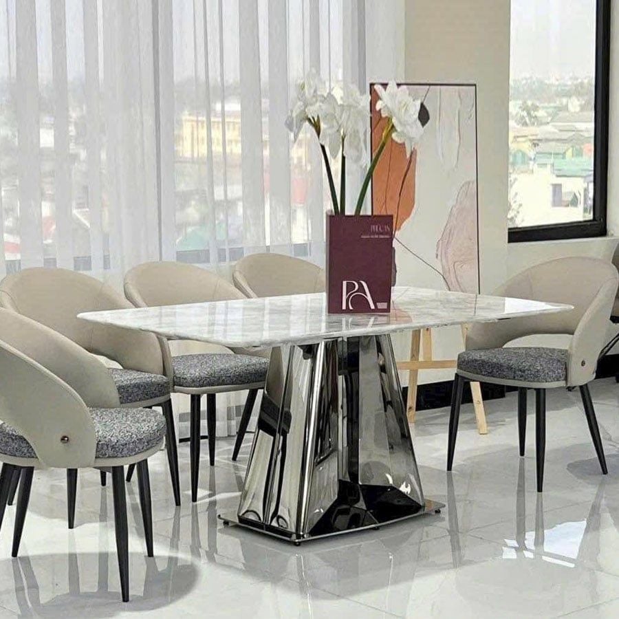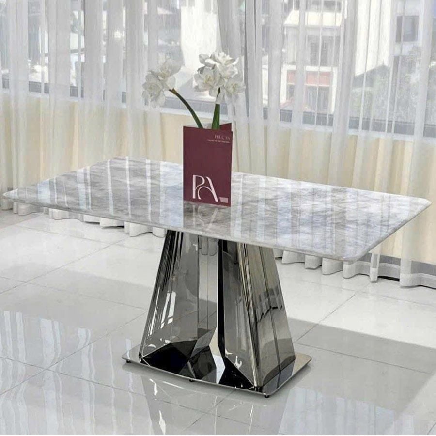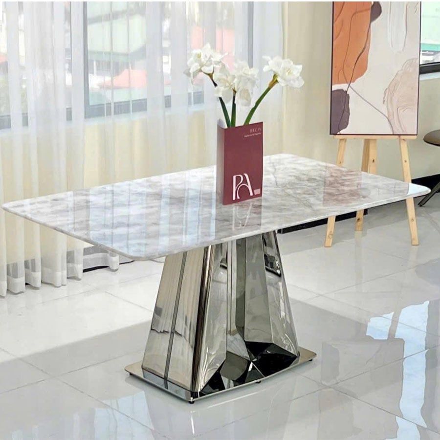 Bàn ăn inox tráng gương mặt đá HAK69 gây ấn tượng với thiết kế chân bàn hình khối kim cương độc đáo, mang đến vẻ đẹp hiện đại và thời thượng. Phần mặt đá marble tự nhiên với vân đá sống động kết hợp cùng phần khung inox 201 tráng gương sáng bóng giúp sản phẩm trở thành điểm nhấn sang trọng cho mọi không gian nội thất cao cấp.