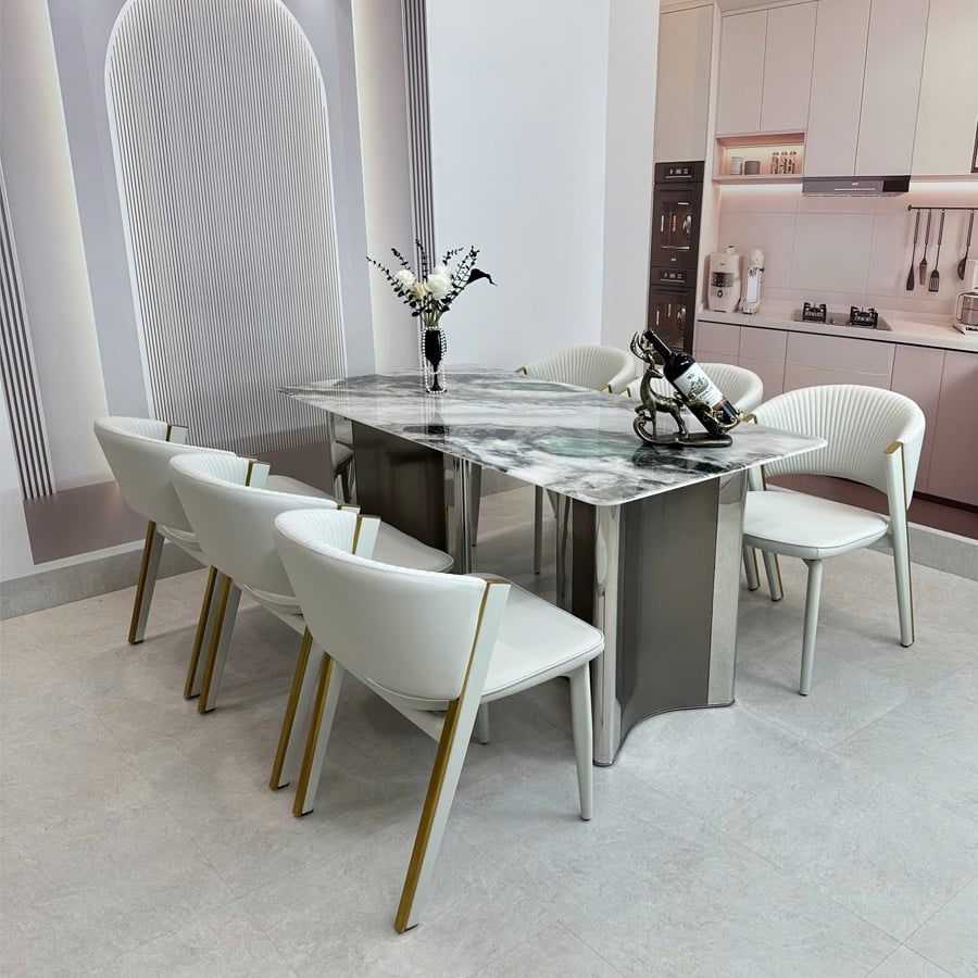 Bàn ăn mặt đá cao cấp HAK22 là lựa chọn hoàn hảo cho gia đình yêu thích sự sang trọng và hiện đại. Với mặt đá thạch anh tinh thể cao cấp, chân inox mạ vàng hồng titan và thiết kế tinh tế, sản phẩm của Laviehome vừa đảm bảo độ bền bỉ vừa nâng tầm không gian phòng ăn.