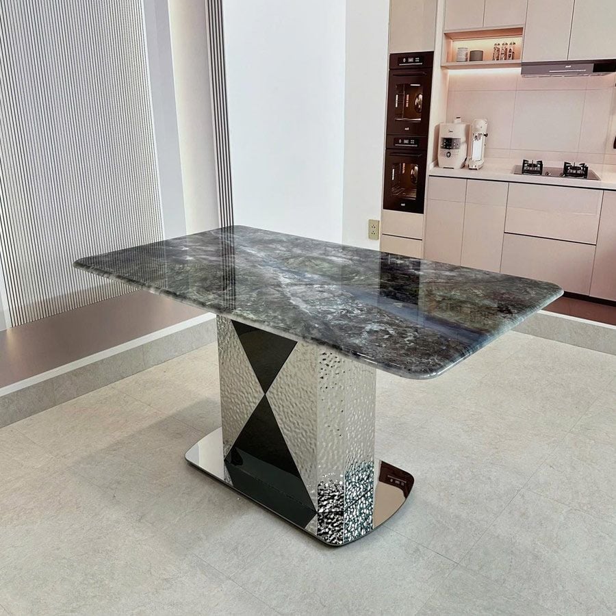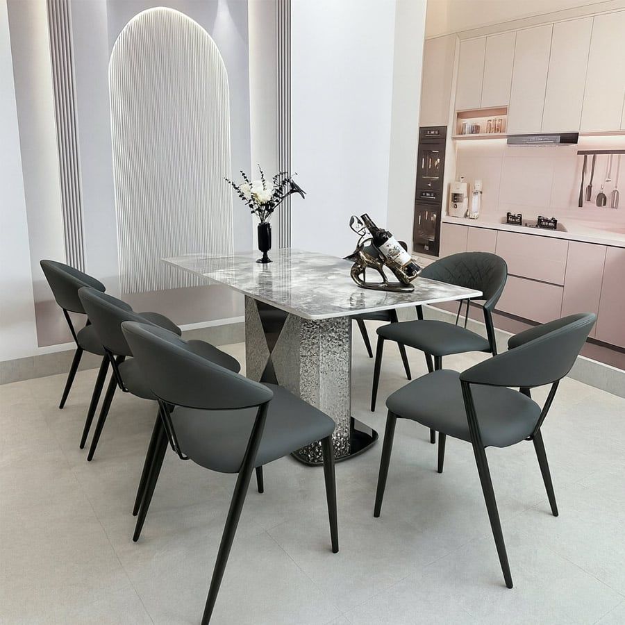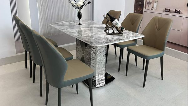 Gam màu vân đá trung tính giúp bàn dễ dàng phối hợp với nhiều mẫu ghế ăn khác nhau, tạo nên tổng thể hài hòa và sang trọng cho không gian sống.