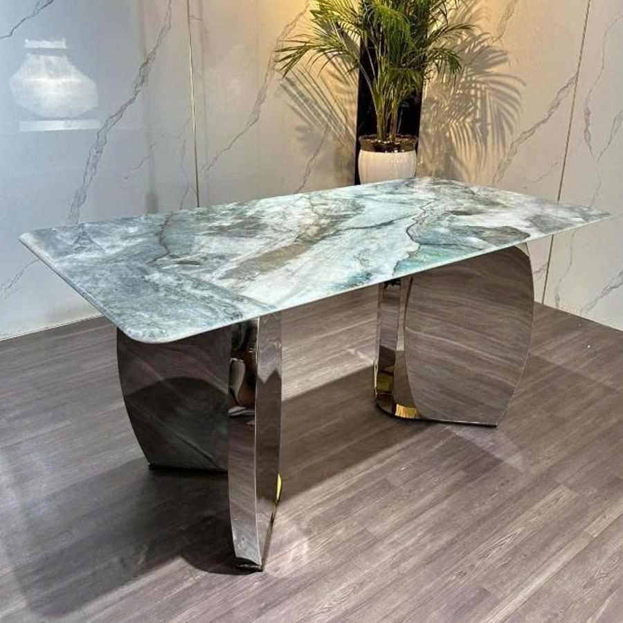 Chất liệu: Mặt bàn đá thạch anh tinh thể cao cấp. Khung bàn inox cao cấp sáng bóng