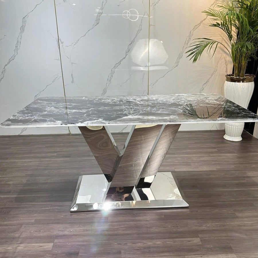 Chất liệu: Mặt bàn đá thạch anh tinh thể cao cấp, bền đẹp, chống trầy xước và chịu nhiệt tốt. Khung bàn inox cao cấp sáng bóng, chống gỉ sét, đảm bảo độ bền vượt trội.