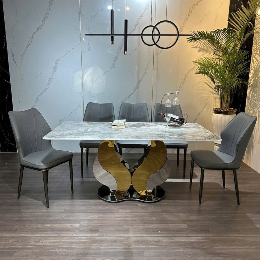 Bàn ăn mặt đá cao cấp HAK72 được thiết kế tinh tế, kết hợp hài hòa giữa mặt bàn đá thạch anh sang trọng và chân inox mạ vàng nghệ thuật. Sản phẩm không chỉ mang tính thẩm mỹ cao mà còn khẳng định đẳng cấp của gia chủ. Với nhiều kích thước đa dạng, mẫu bàn ăn mặt đá hiện đại này phù hợp cho gia đình từ 4 – 10 người, tạo không gian ấm cúng và hiện đại cho mỗi bữa ăn.