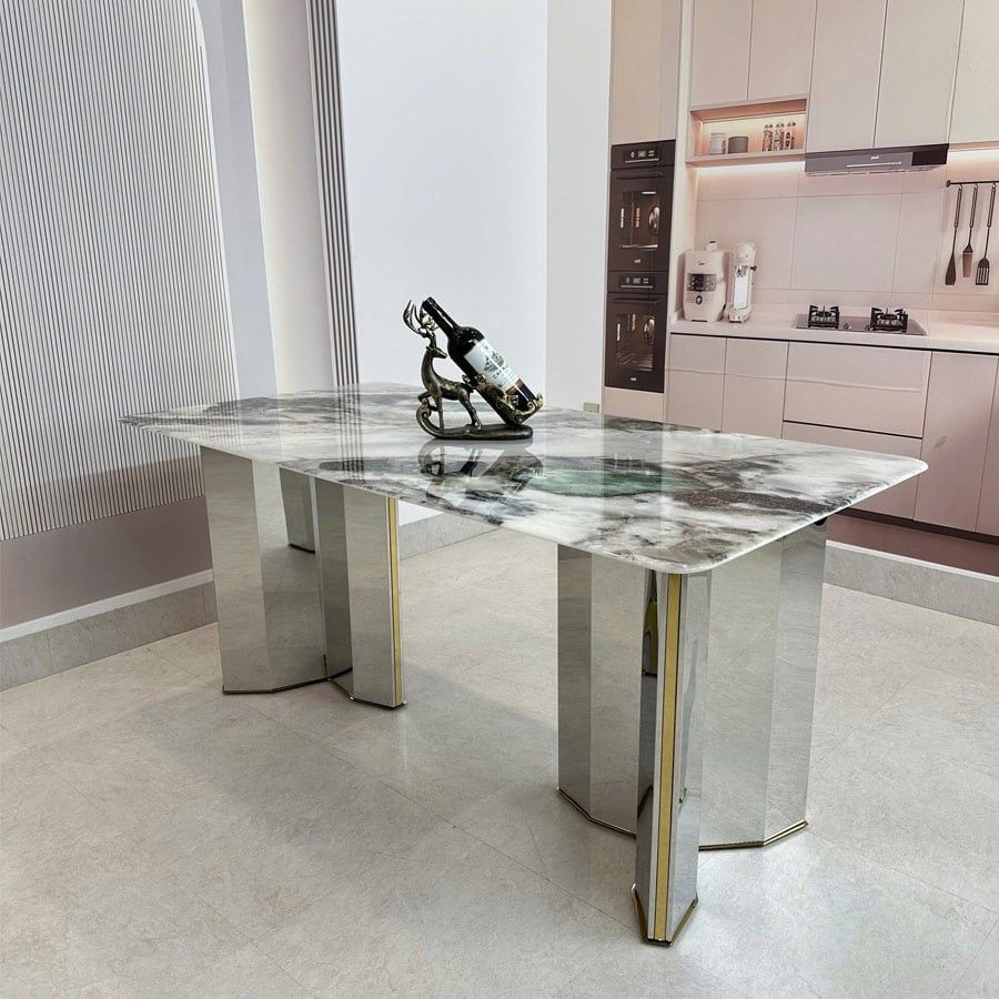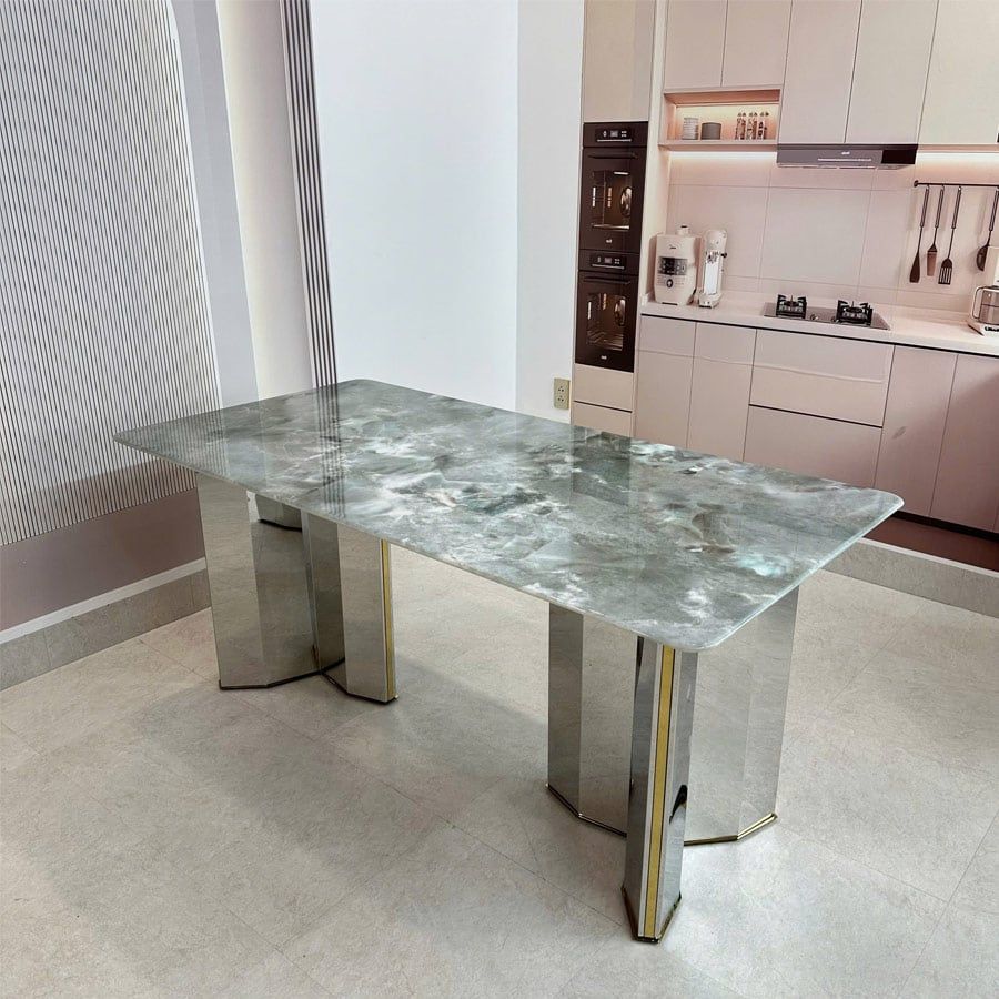 Bàn ăn mặt đá cao cấp HAK78 là lựa chọn hoàn hảo cho không gian phòng ăn mang phong cách hiện đại và sang trọng. Mặt đá thạch anh tinh thể cao cấp được xử lý tỉ mỉ, mang đến vẻ đẹp tự nhiên cùng độ bền vượt trội. Các đường vân đá tinh xảo kết hợp cùng chân bàn inox sáng bóng, tạo nên một tổng thể hài hòa và đẳng cấp.
