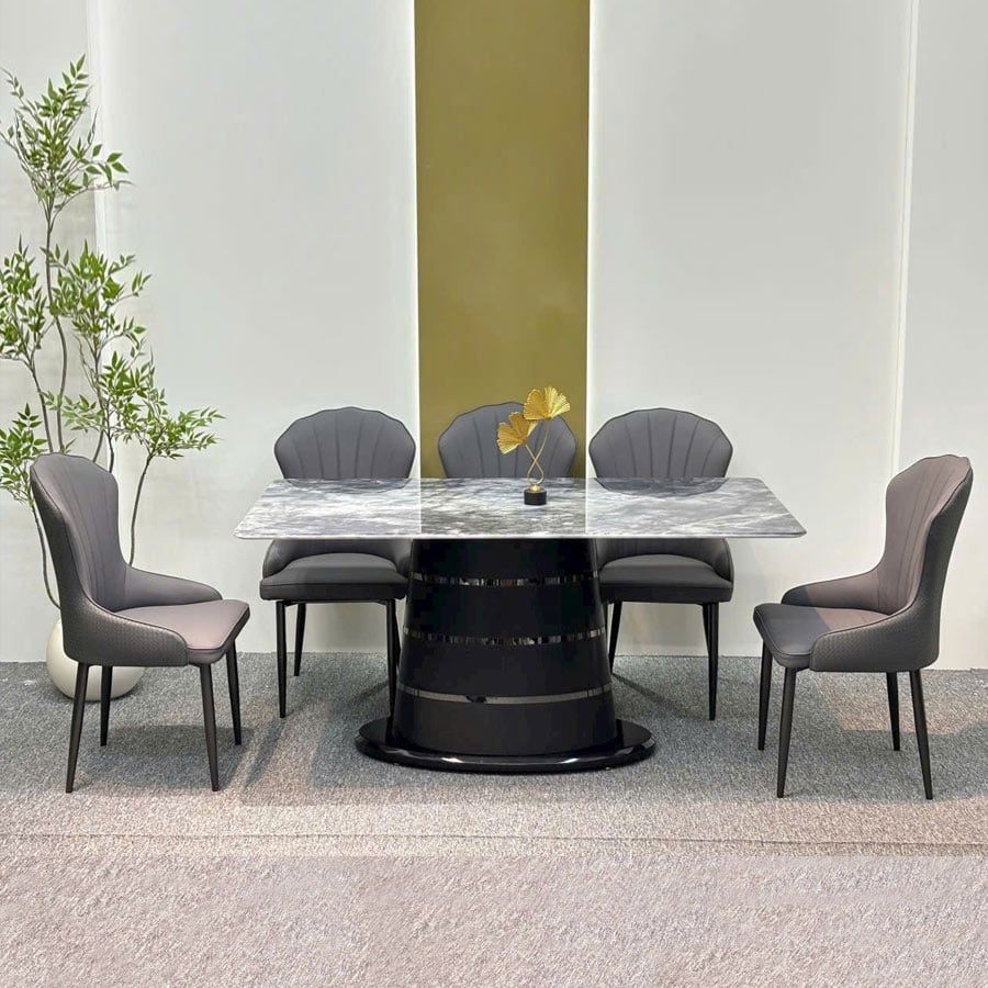Bàn ăn mặt đá cao cấp VNT2109 nổi bật với thiết kế chân trụ giữa độc đáo, tạo điểm nhấn ấn tượng và mới lạ cho không gian ăn uống. Mặt đá vi tinh thể màu xám vân tự nhiên kết hợp khung chân gỗ được xử lý phủ bóng, mang lại vẻ ngoài sang trọng và hiện đại. Với sự tinh tế trong từng đường nét, bàn ăn mặt đá cao cấp VNT2109 là sự lựa chọn lý tưởng cho phòng ăn gia đình, chung cư cao cấp, hoặc các không gian tiếp khách lịch sự.