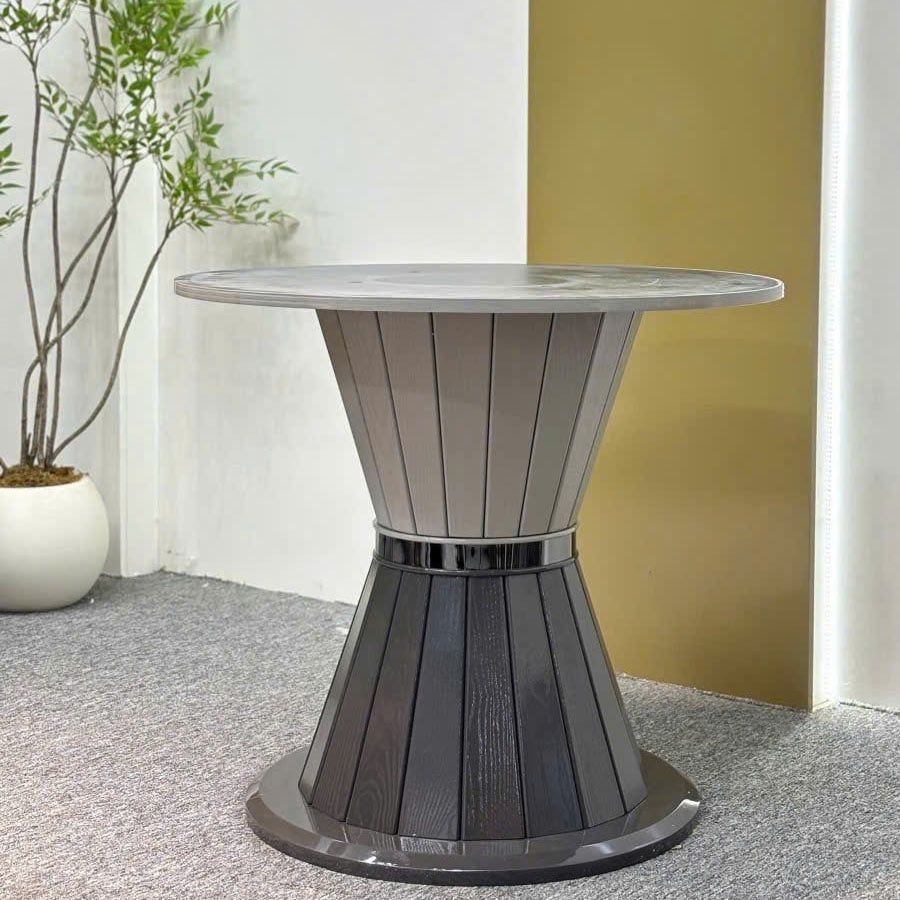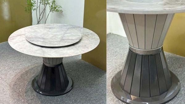 Mẫu bàn ăn tròn VNC1127 là sự lựa chọn hoàn hảo cho những không gian đề cao sự gắn kết và đối thoại trong gia đình. Thiết kế mặt tròn kết hợp mâm xoay trung tâm tiện lợi giúp mọi thành viên dễ dàng sử dụng bữa ăn chung. Mặt bàn đá vi tinh thể không chỉ sáng bóng, sang trọng mà còn có khả năng chống thấm, chống xước vượt trội. Phần chân bàn làm từ gỗ sồi kết hợp nẹp inox cao cấp tạo nên sự chắc chắn và vẻ đẹp hài hòa, hiện đại.