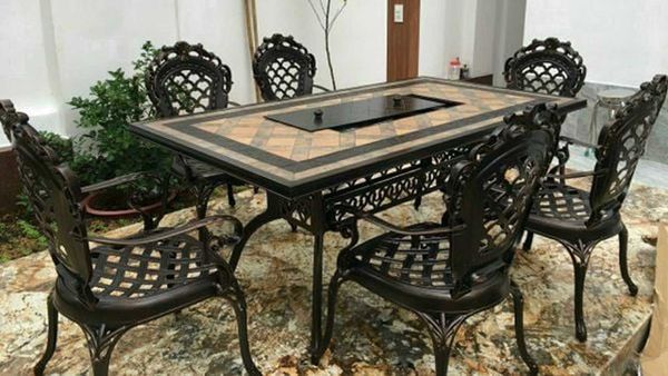 Chất liệu: Nhôm đúc, sơn tĩnh điện, mặt đá gốm có bếp than/ bếp điện