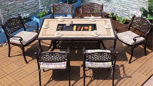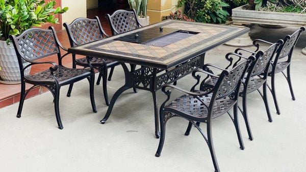 Bàn Chữ Nhật Nhôm Đúc Ngoài Trời Mặt Đá Có Bếp Nướng DPBV14B tích hợp bếp nướng, thiết kế tinh tế và sang trọng, là điểm nhấn hoàn hảo cho không gian ngoài trời. Sản phẩm kết hợp giữa khung nhôm đúc sơn tĩnh điện và mặt đá gốm, đảm bảo sự bền bỉ và thẩm mỹ vượt trội. Phần bếp nướng tích hợp, có thể sử dụng với bếp than hoặc bếp điện, mang đến trải nghiệm ẩm thực thú vị ngay trong không gian sân vườn của bạn.