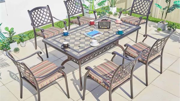 Bàn Chữ Nhật Nhôm Đúc Ngoài Trời Mặt Đá DPBV15A sở hữu thiết kế độc đáo với mặt đá hoa văn lạ mắt, mang đến nét sang trọng và đẳng cấp cho khu vực sân vườn hay ban công của bạn. Với chất liệu nhôm đúc kết hợp mặt đá cao cấp, sản phẩm không chỉ tạo điểm nhấn mà còn đảm bảo độ bền lâu dài, chống chịu tốt với thời tiết ngoài trời.