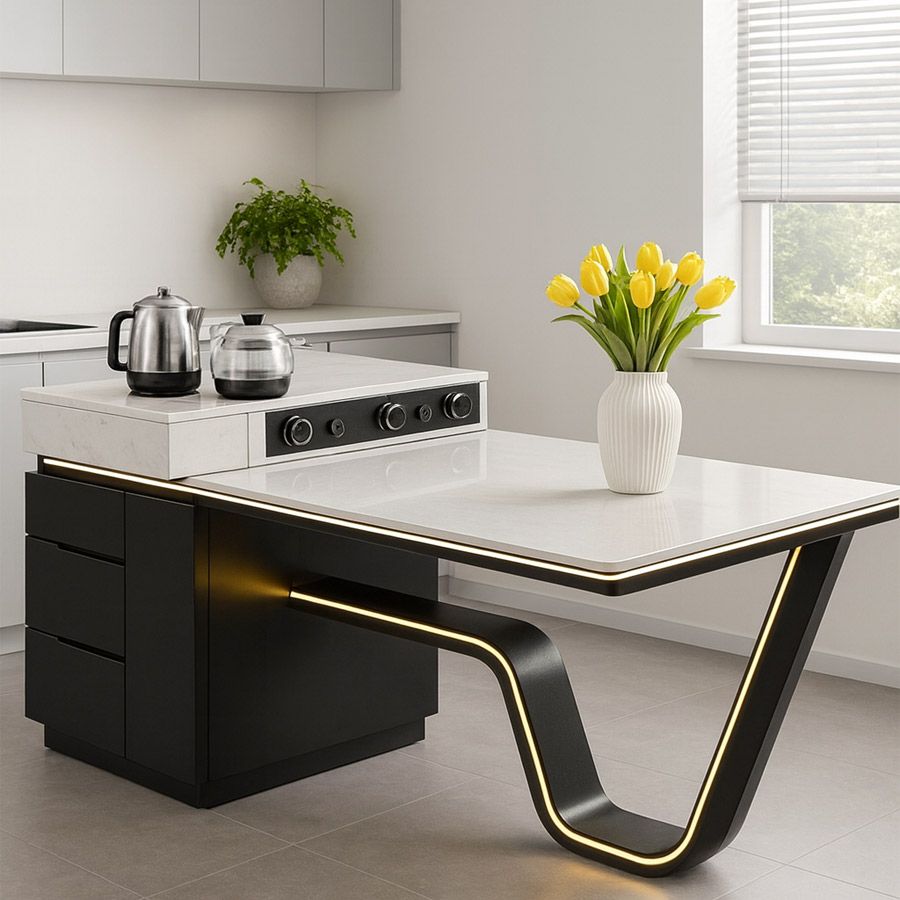 Bàn đảo bếp AD8829 là sự kết hợp hoàn hảo giữa thẩm mỹ sang trọng và công năng hiện đại. Mặt bàn sử dụng đá Ceramic trắng vân mây tinh tế, vừa chống trầy xước, chống ố bẩn, vừa chịu nhiệt tốt. Phần khung bàn được làm từ gỗ MDF cao cấp, phủ sơn bóng hiện đại, kết hợp chân thép mạ niken và hệ thống đèn LED viền tạo hiệu ứng ánh sáng sang trọng, giúp không gian bếp trở nên nổi bật và cuốn hút.