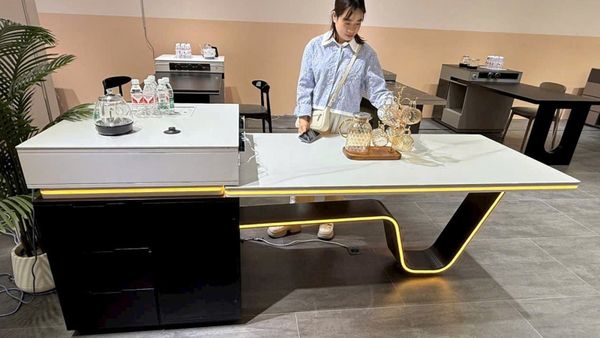 Chất liệu: Khung MDF, chân thép mạ niken, mặt đá Ceramic, đèn LED trang trí