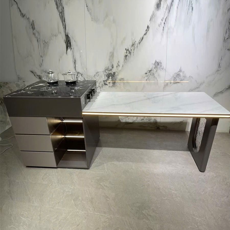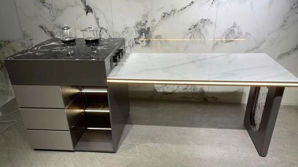 Chân bàn được thiết kế vững chắc với điểm nhấn họa tiết hình học tinh xảo, mang đến nét hiện đại và độc đáo. Viền bàn được trang bị dải LED trang trí, tạo hiệu ứng ánh sáng sang trọng, làm nổi bật không gian bếp.