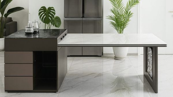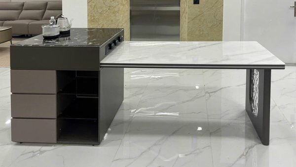 Bàn đảo bếp ADT8852 là sự kết hợp hoàn hảo giữa tính thẩm mỹ cao cấp và công năng hiện đại. Mặt bàn sử dụng đá Ceramic trắng vân mây sang trọng, kết hợp với phần khung màu xám kim loại tạo cảm giác tinh tế, đẳng cấp. Đặc biệt, bếp tích hợp trên mặt đảo cùng hệ thống tủ và kệ lưu trữ tiện lợi, giúp tối ưu không gian và tăng tính ứng dụng cho căn bếp.