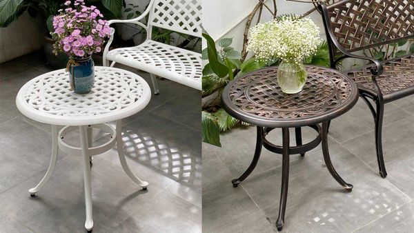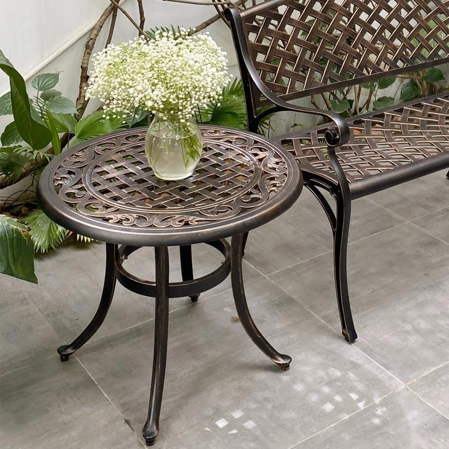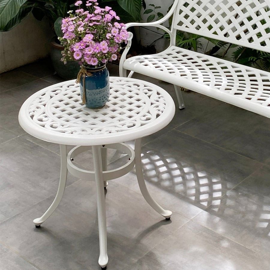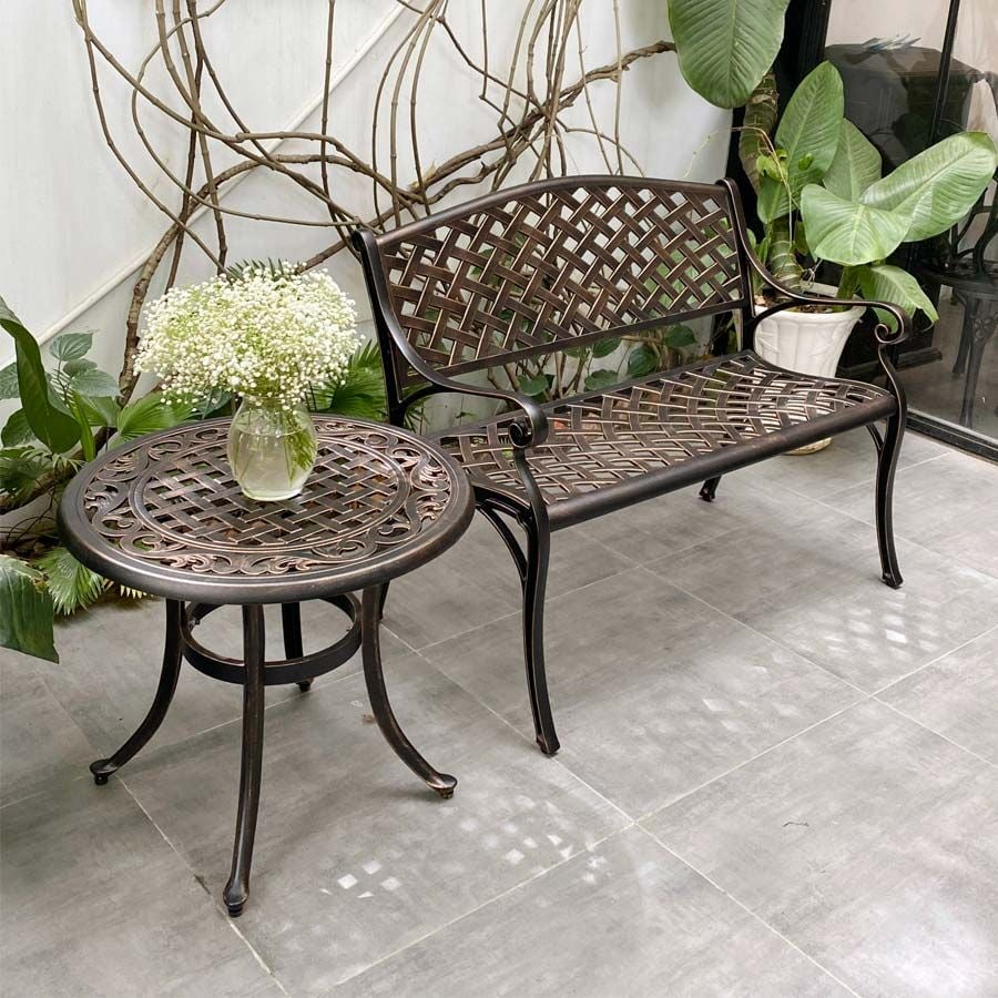 Khung bàn được làm từ nhôm đúc nguyên khối, có khả năng chống gỉ sét và chịu lực tốt. Lớp sơn tĩnh điện giúp bảo vệ bề mặt bàn khỏi các tác động của môi trường, giữ cho sản phẩm luôn bền đẹp theo thời gian. Mặt bàn được thiết kế với hoa văn tinh xảo, mang lại vẻ đẹp cổ điển và sang trọng.
