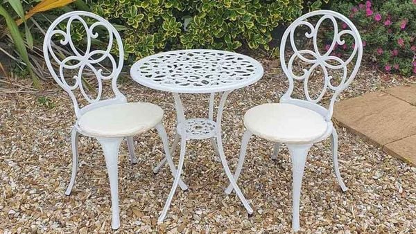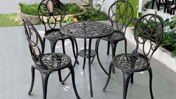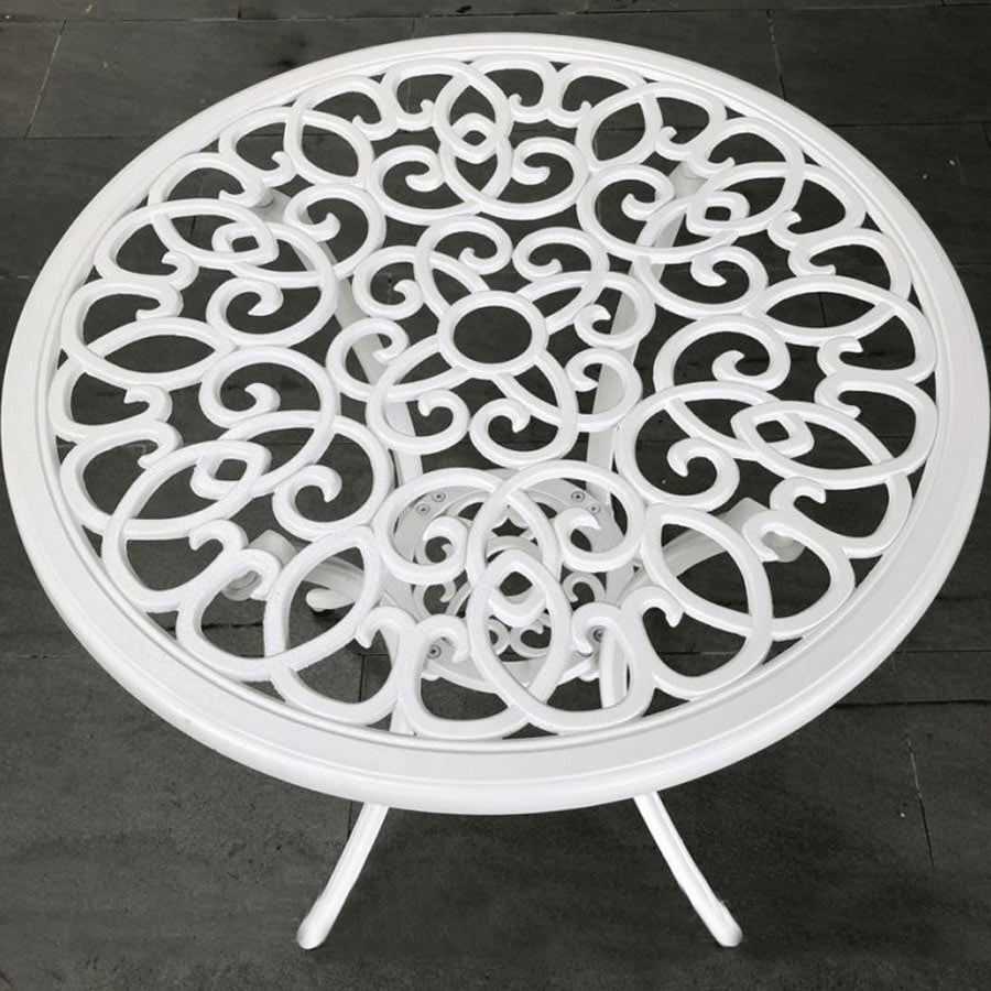 Khung bàn được làm từ nhôm đúc nguyên khối, không chỉ nhẹ nhàng và dễ di chuyển mà còn có khả năng chống gỉ sét và chịu lực tốt. Lớp sơn tĩnh điện giúp bảo vệ bề mặt bàn khỏi các tác động của môi trường, giữ cho sản phẩm luôn bền đẹp theo năm tháng. Mặt bàn được thiết kế với hoa văn tinh xảo, tạo điểm nhấn thẩm mỹ cho không gian sử dụng.