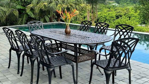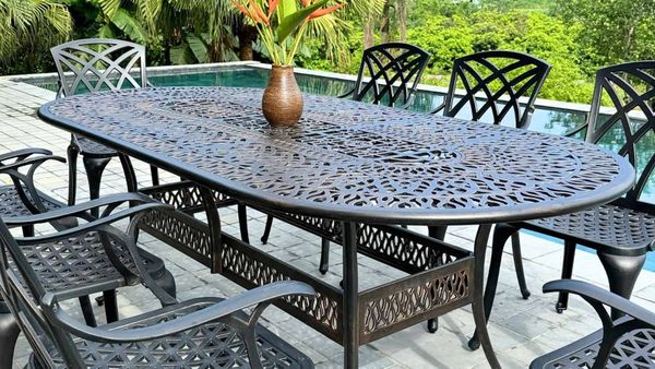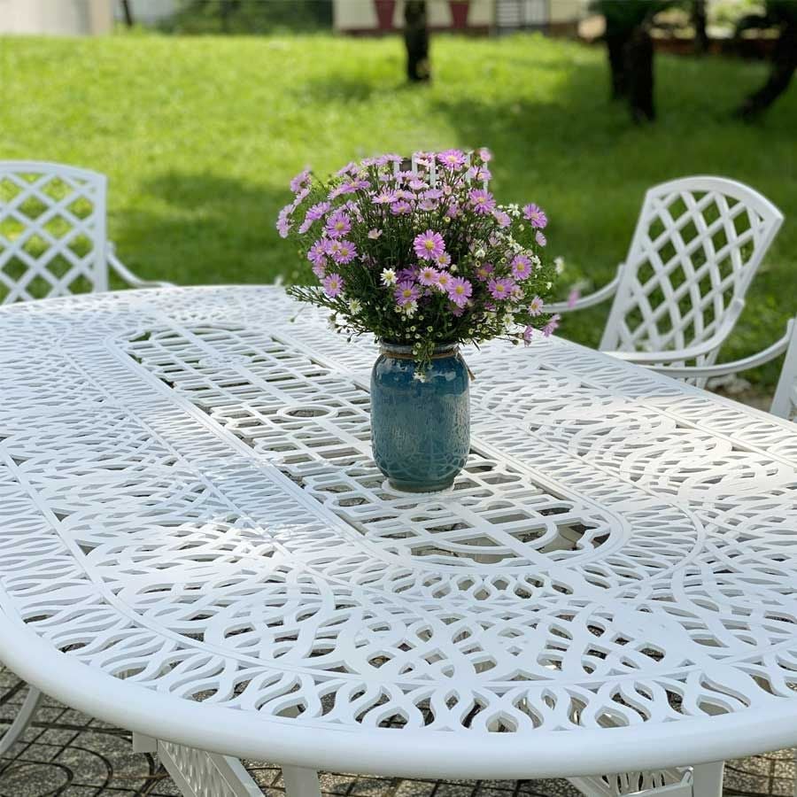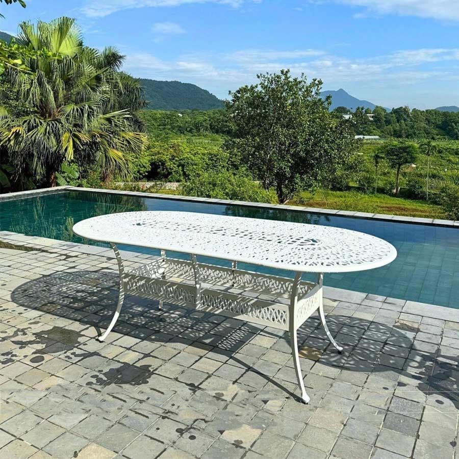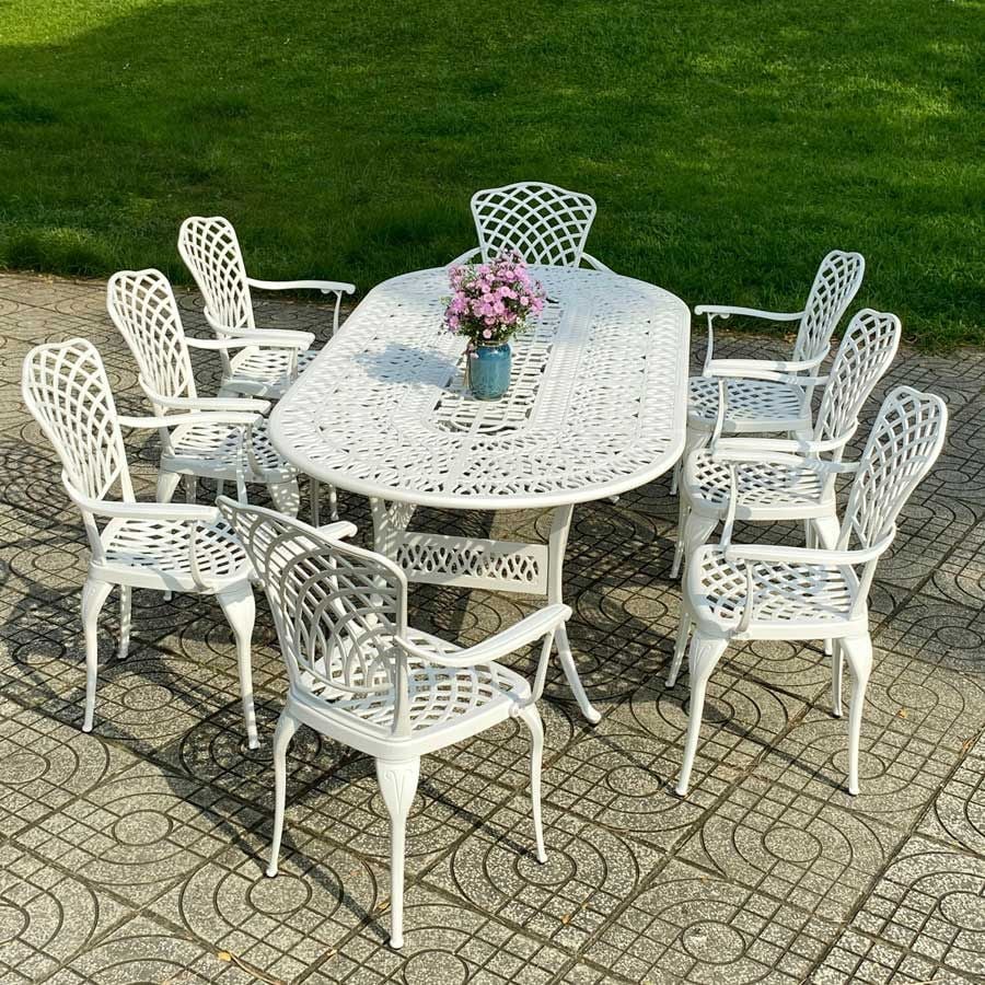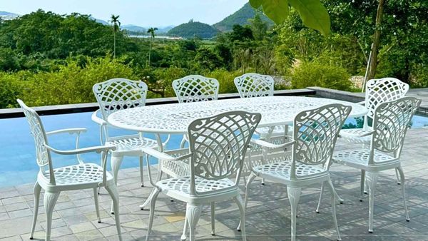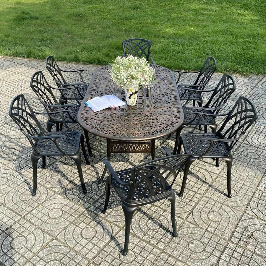 Khung bàn được làm từ nhôm đúc nguyên khối, có khả năng chống gỉ sét và chịu lực tốt. Lớp sơn tĩnh điện giúp bảo vệ bề mặt bàn khỏi các tác động của môi trường, đảm bảo sản phẩm luôn bền đẹp theo năm tháng. Mặt bàn được thiết kế với hoa văn tinh xảo, mang lại vẻ đẹp cổ điển và sang trọng, đồng thời dễ dàng vệ sinh và bảo quản.