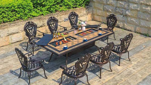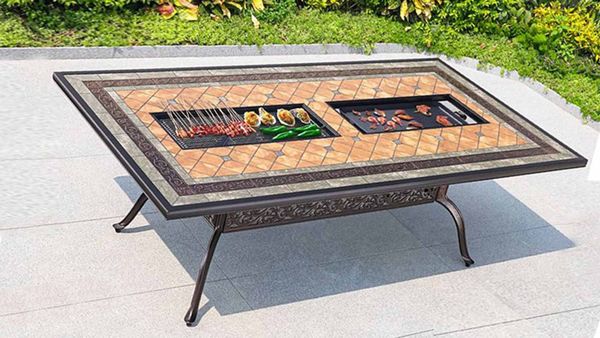Chất liệu: Nhôm đúc, sơn tĩnh điện, mặt đá gốm có bếp than/bếp điện