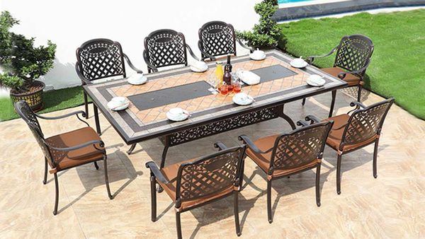 - Chất liệu nhôm đúc cao cấp: Khung bàn được chế tác từ nhôm đúc nguyên khối, sơn tĩnh điện chống gỉ sét, đảm bảo độ bền bỉ trước mọi điều kiện thời tiết.