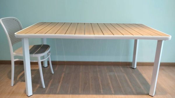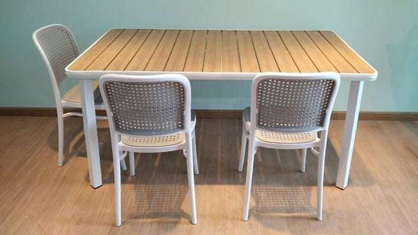- Mặt bàn nan Composite giả gỗ mang lại vẻ đẹp tự nhiên, không cong vênh, chống thấm nước và dễ vệ sinh.