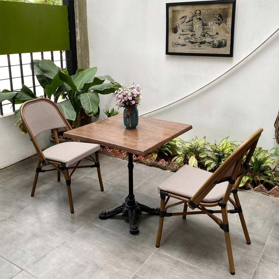 - Độ Bền Vượt Trội: Chân gang đúc chắc chắn và mặt bàn gỗ phủ resin bền bỉ giúp sản phẩm phù hợp với môi trường ngoài trời.
