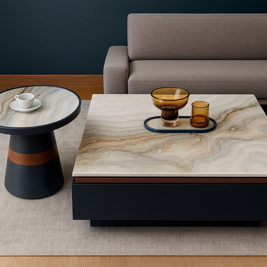 Thiết kế bàn đôi với bàn lớn vuông và bàn nhỏ dạng tròn hoặc chữ nhật (tùy màu) cho phép bố trí linh hoạt. Sự phối hợp đường nét tối giản cùng màu sắc nổi bật tạo nên điểm nhấn ấn tượng, phù hợp với nhiều loại sofa và phong cách nội thất hiện đại.