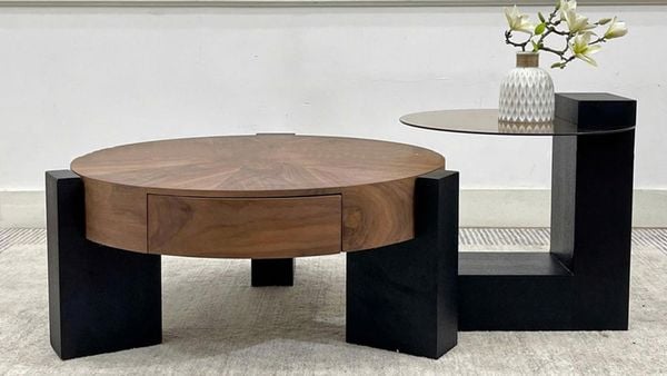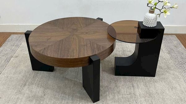 Chất liệu: Bàn lớn: Mặt gỗ phủ veneer sang trọng, thân gỗ sơn phủ đen hiện đại.Bàn nhỏ: Mặt kính cường lực cao cấp, thân gỗ sơn phủ đen tinh tế.