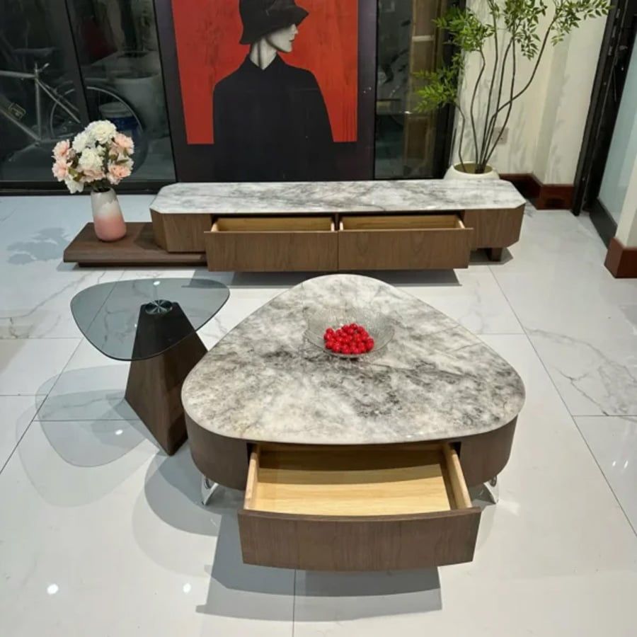 Bàn trà đôi ADHB8002 là điểm nhấn tinh tế cho không gian phòng khách hiện đại. Thiết kế độc đáo với sự kết hợp giữa hai bàn có kích thước khác nhau mang đến sự linh hoạt trong bố trí, vừa tiết kiệm diện tích, vừa tăng thêm tính thẩm mỹ. Mặt bàn đá cẩm thạch tự nhiên với đường vân mềm mại và lớp kính cường lực sáng bóng giúp tôn lên vẻ đẹp sang trọng, hiện đại. Khung bàn được làm từ gỗ MDF phủ veneer cao cấp, tạo cảm giác ấm cúng nhưng vẫn đẳng cấp.