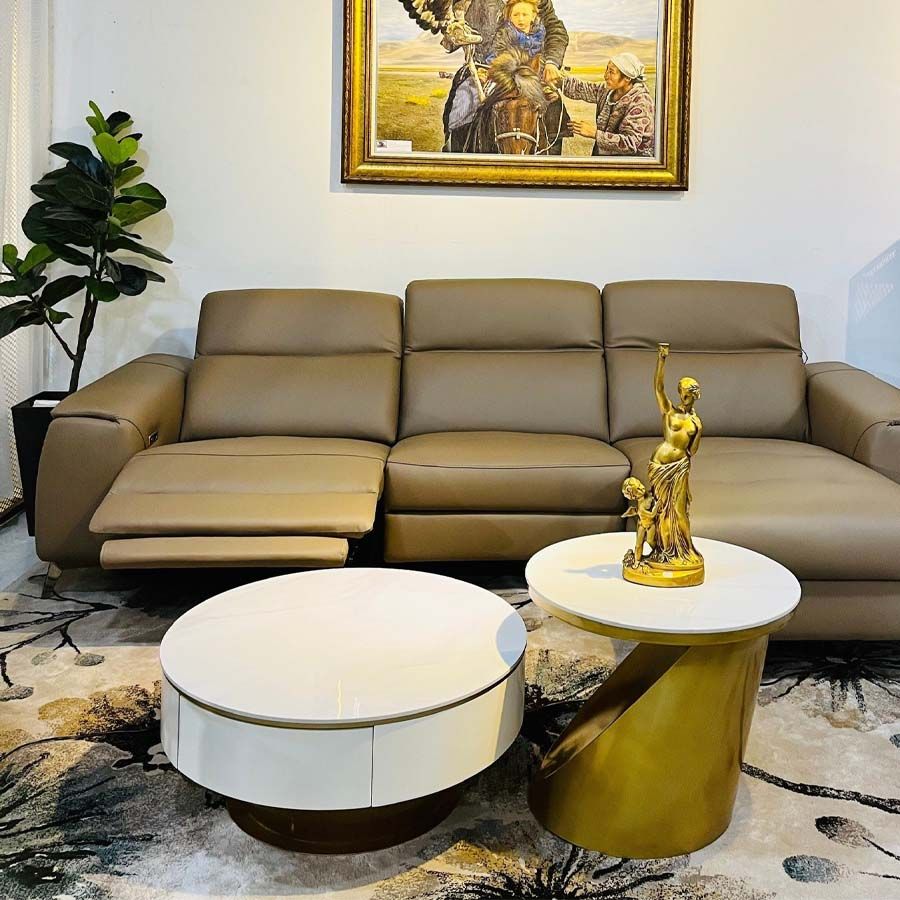 - Mặt đá tự nhiên cao cấp: Mặt bàn được làm từ đá tự nhiên trắng vân mây, mang lại vẻ đẹp sang trọng, bền bỉ và dễ dàng vệ sinh. Mặt đá sáng bóng giúp tôn lên không gian và tạo điểm nhấn tinh tế cho phòng khách.