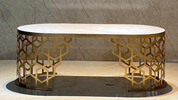 - Chân inox mạ vàng với họa tiết tổ ong: Chân bàn được thiết kế với các ô tổ ong độc đáo, mạ vàng sáng bóng, không chỉ nâng cao giá trị thẩm mỹ mà còn thể hiện phong cách đẳng cấp.