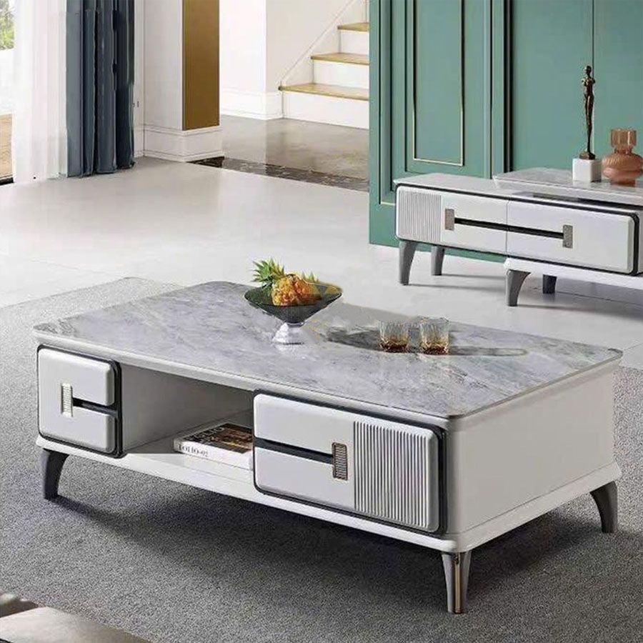 Bàn trà Laura là mẫu bàn trà hiện đại, kết hợp giữa mặt đá marble nhân tạo trắng vân mây và khung MDF bền chắc, mang lại vẻ đẹp sang trọng và tinh tế cho không gian phòng khách. Thiết kế bàn hình chữ nhật với ngăn kéo và kệ tiện dụng, phù hợp cho việc lưu trữ và trang trí.