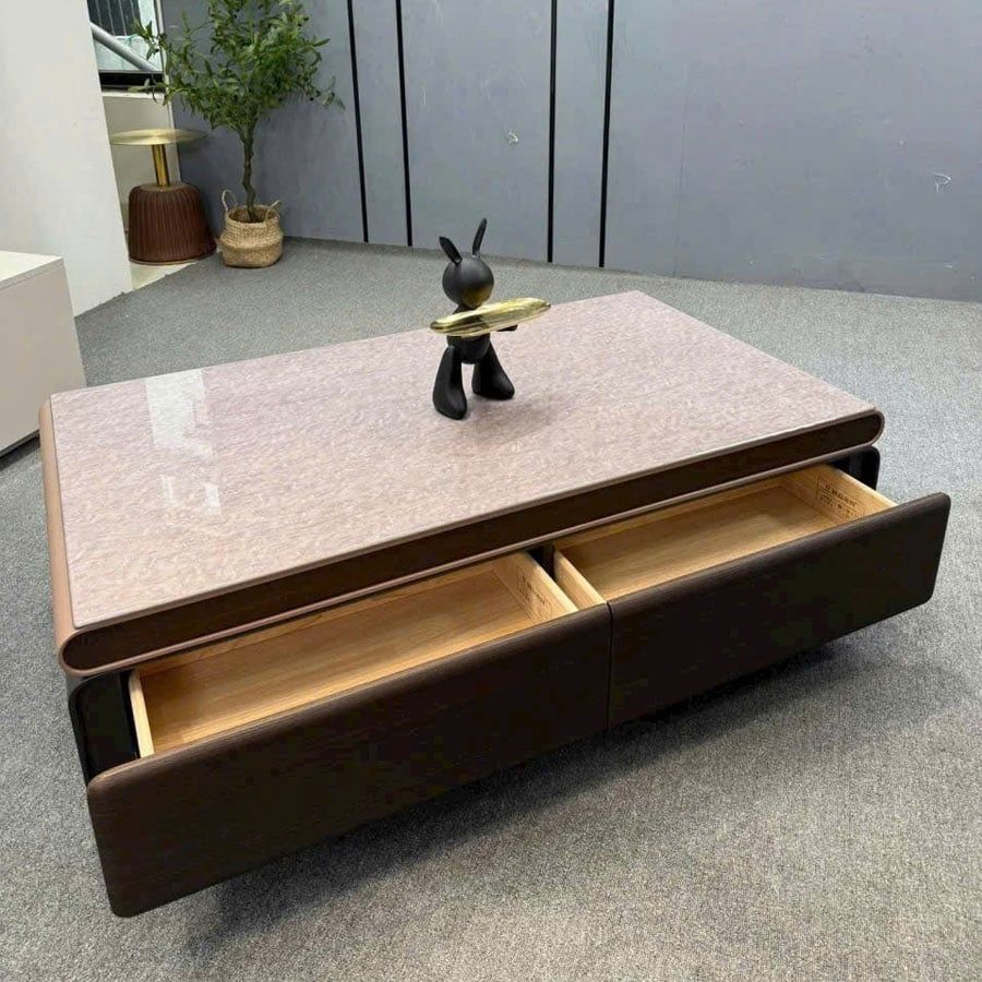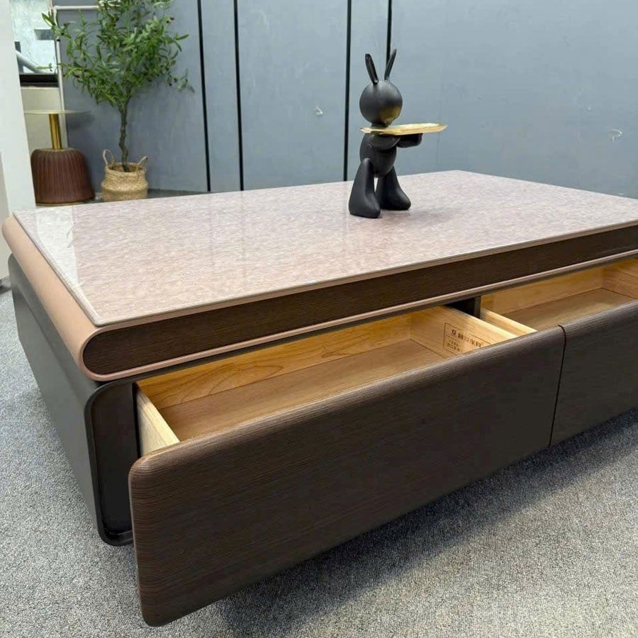 Phần thân bàn phủ veneer vân gỗ nâu trầm mang lại cảm giác ấm áp, hài hòa, phù hợp với nhiều phong cách nội thất từ hiện đại, tối giản đến cao cấp.