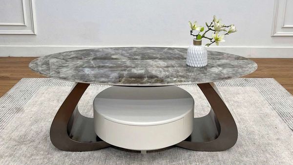 Bàn trà Curve AK2060 gây ấn tượng mạnh với thiết kế mặt bàn hình oval độc đáo, giúp không gian phòng khách trở nên mềm mại, cân đối và trang nhã hơn. Sự kết hợp giữa mặt đá tinh thể cao cấp và chân bàn uốn cong đầy nghệ thuật mang đến một tổng thể vừa hiện đại, vừa đậm chất thẩm mỹ.