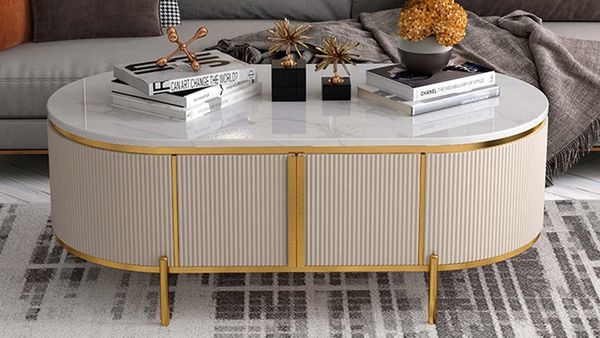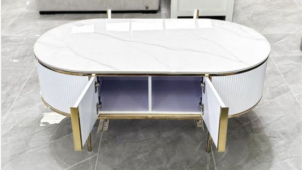 - Thiết kế oval mềm mại: Bàn trà có kiểu dáng oval thanh lịch, tạo cảm giác mềm mại và sang trọng, phù hợp với nhiều phong cách nội thất khác nhau.