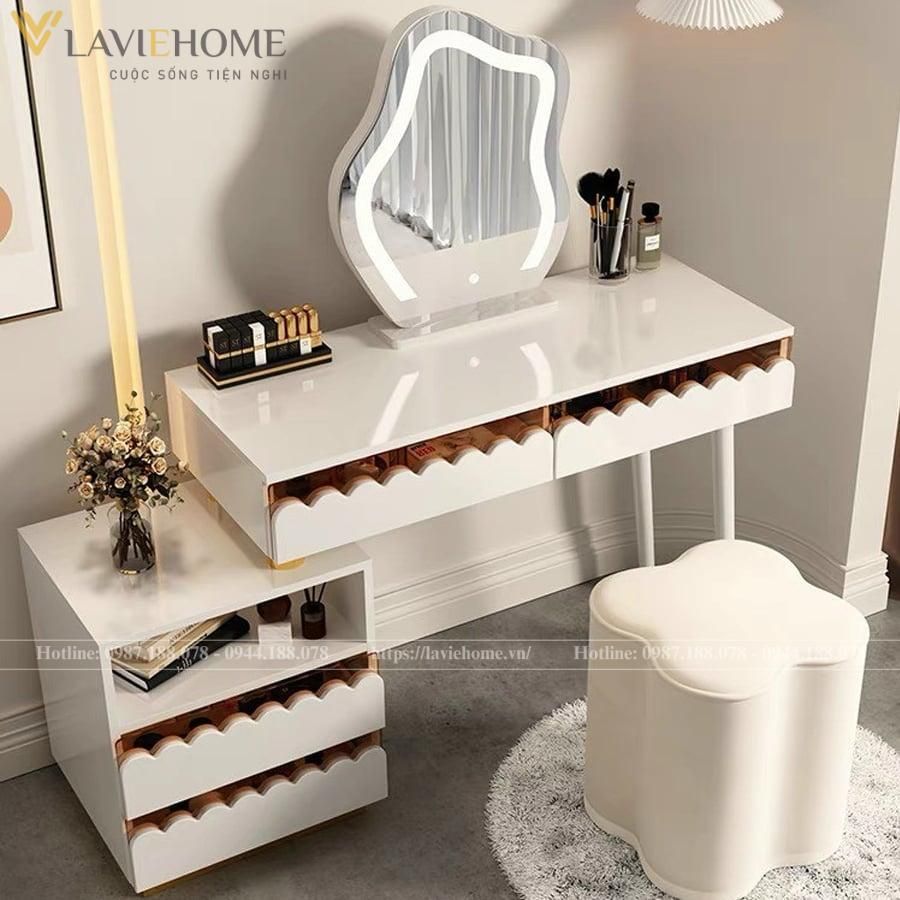 - Ngăn kéo rộng rãi: Thiết kế dạng lượn sóng độc đáo, giúp lưu trữ mỹ phẩm và phụ kiện gọn gàng.