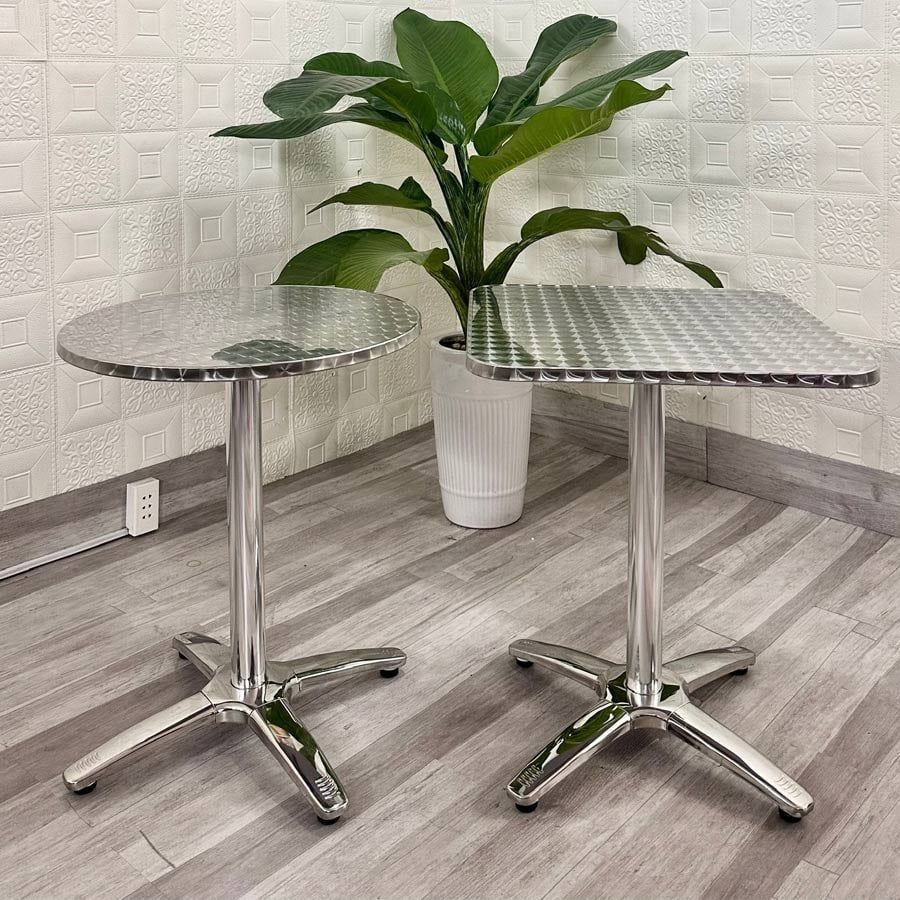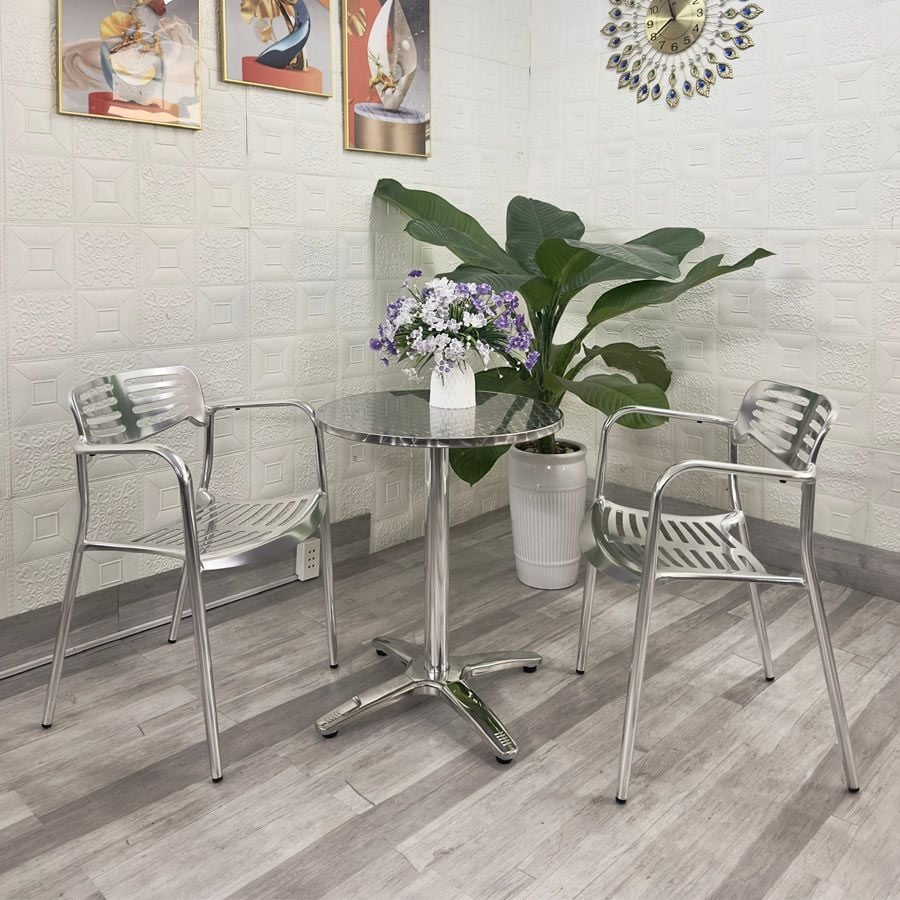 Bàn tròn hợp kim nhôm DPBV28B là lựa chọn lý tưởng cho các không gian quán café, sân vườn, ban công hoặc khu vực tiếp khách nhỏ. Thiết kế đơn giản nhưng tinh tế với bề mặt inox sáng bóng, tạo nên phong cách hiện đại và sang trọng. Chất liệu hợp kim nhôm nhẹ nhưng chắc chắn, giúp bàn dễ dàng di chuyển và phù hợp cho cả không gian trong nhà lẫn ngoài trời.