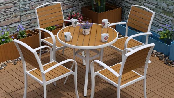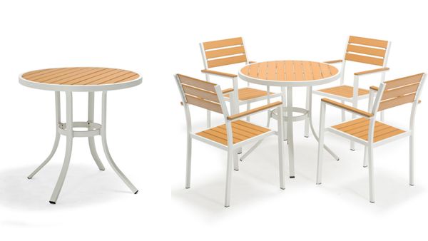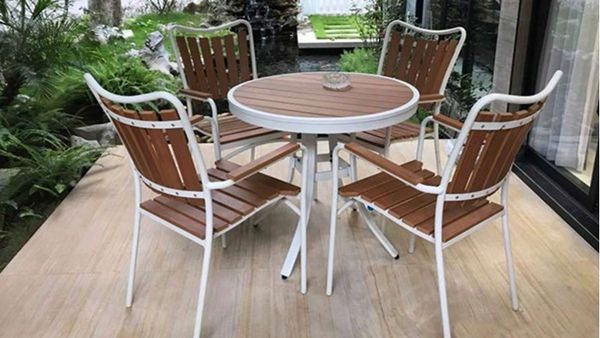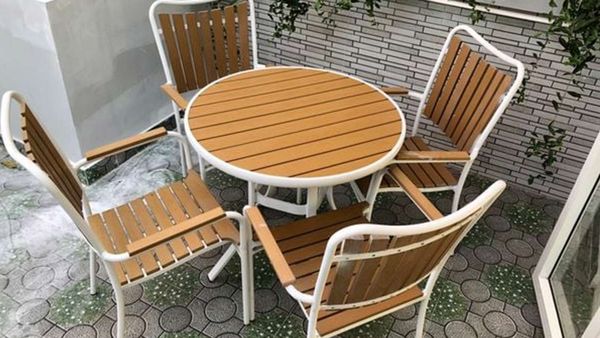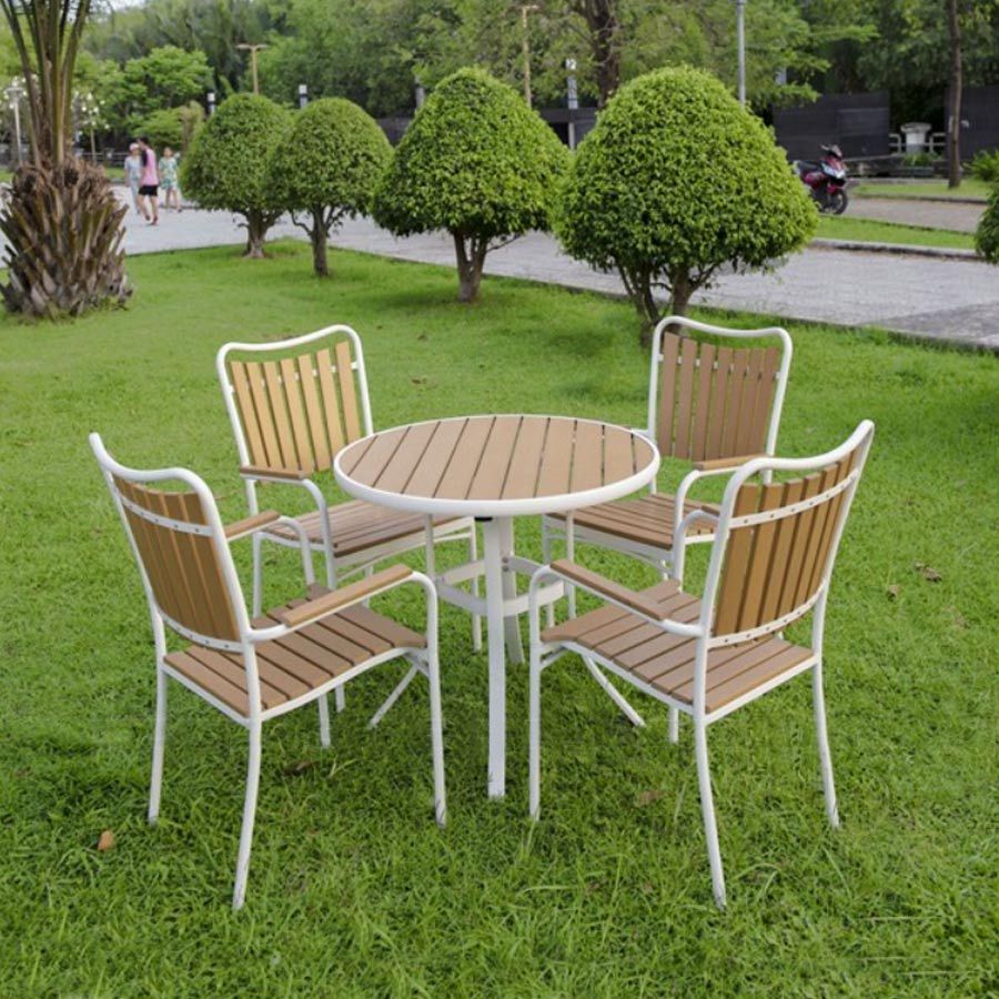 Chất liệu: Khung nhôm sơn tĩnh điện, mặt bàn nan Polywoodgiả gỗ bền bỉ, chống thấm nước