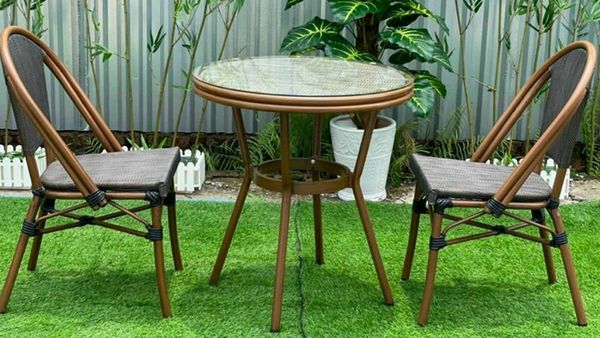 Chất liệu: Khung nhôm đúc, mặt bàn nhựa giả mây, mặt kính