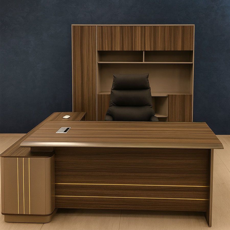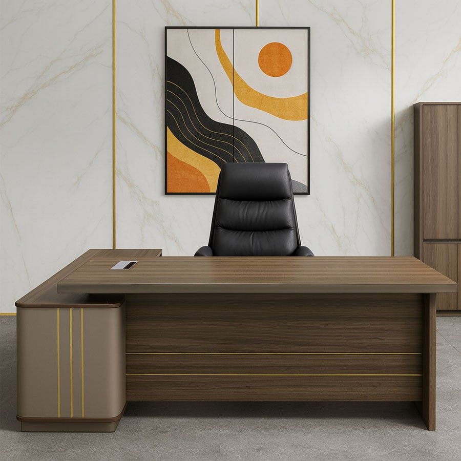 Bàn văn phòng giám đốc TKGDB02 được thiết kế dành riêng cho không gian làm việc cao cấp, mang đến vẻ đẹp hiện đại, sang trọng và thể hiện quyền uy của người lãnh đạo. Với tone màu gỗ nâu kết hợp chi tiết kim loại mạ ánh vàng tinh tế, sản phẩm vừa toát lên sự mạnh mẽ, vừa giữ nét thanh lịch, phù hợp với mọi phong cách nội thất văn phòng.