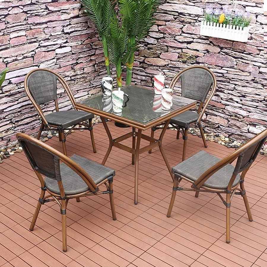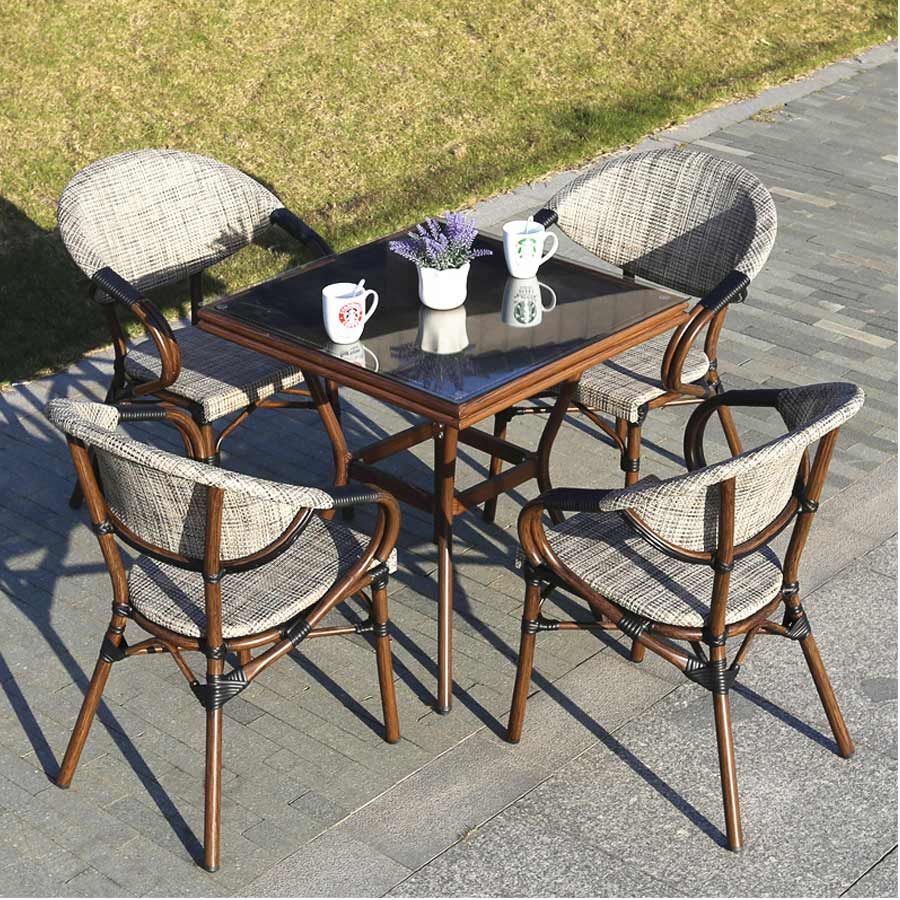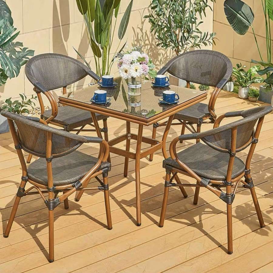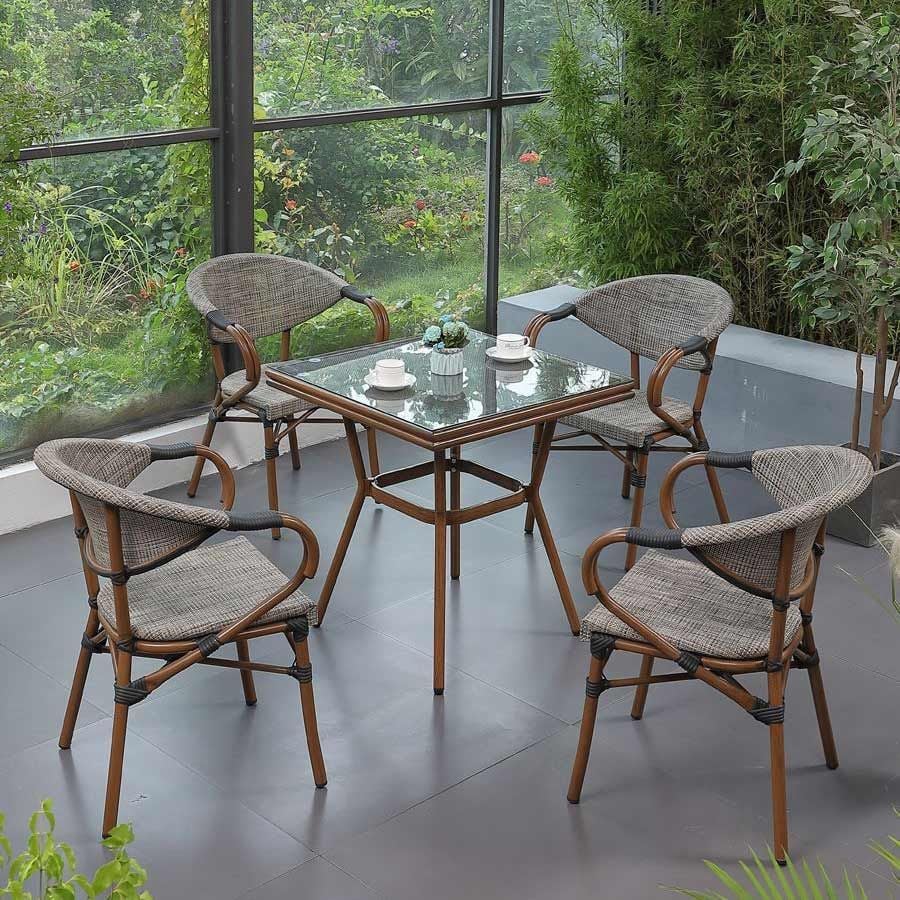 Chất liệu: Khung nhôm đúc, mặt bàn nhựa giả mây, mặt kính