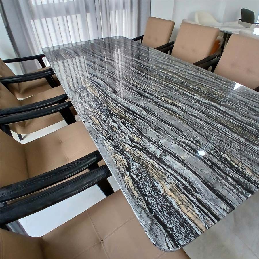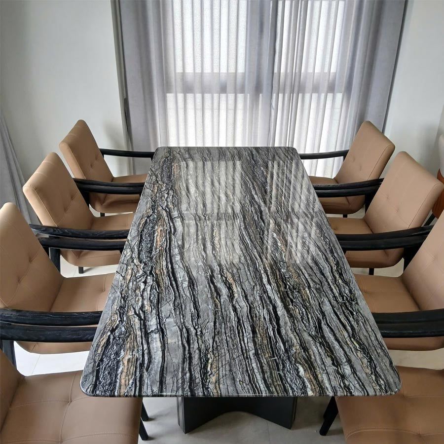 Chất liệu bàn: Mặt đá bạch ngọc tinh thể cao cấp, chống trầy xước, bền bỉ. Khung bàn làm từ inox mạ niken sáng bóng, chắc chắn và hiện đại.