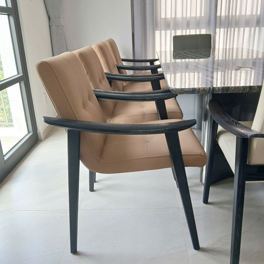 Chất liệu ghế: Da công nghiệp cao cấp, mềm mại, thoáng khí, kết hợp chân gỗ ASH tự nhiên bền vững, sang trọng.