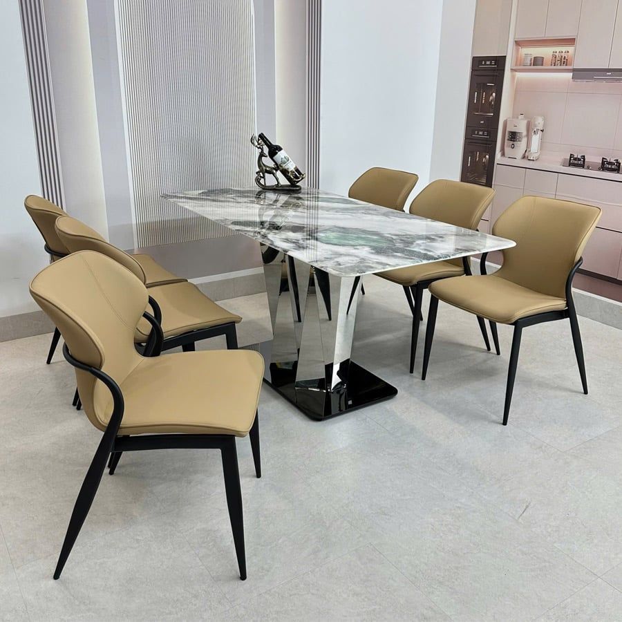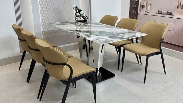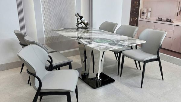 Bộ bàn ăn HAK83 + HAG33 là sự kết hợp hoàn hảo giữa thiết kế hiện đại và chất liệu cao cấp, mang lại không gian ăn uống sang trọng và tinh tế. Mặt đá vi tinh thể với vân đá tự nhiên tạo điểm nhấn nổi bật, dễ dàng vệ sinh và có độ bền cao.