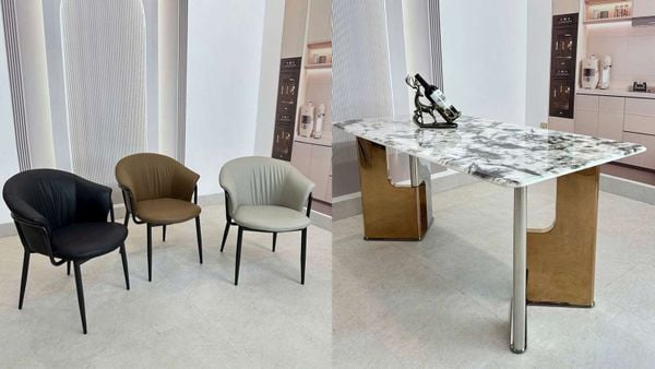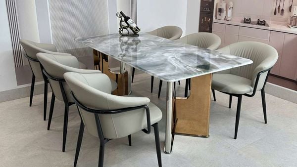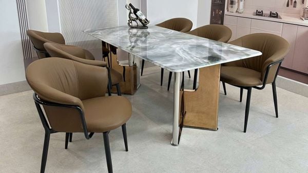 Bộ bàn ăn mặt đá HAK80 kết hợp cùng ghế Davi HAG58 mang lại sự sang trọng và hiện đại cho không gian phòng ăn. Mặt bàn đá thạch anh tinh thể cao cấp với vân đá tinh xảo, kết hợp cùng chân inox mạ vàng sáng bóng tạo điểm nhấn đẳng cấp. Ghế Xavia HAG58 với nệm da NANO chống mèo cào và khung thép mạ titan chắc chắn, mang lại sự thoải mái tối đa cho người ngồi.